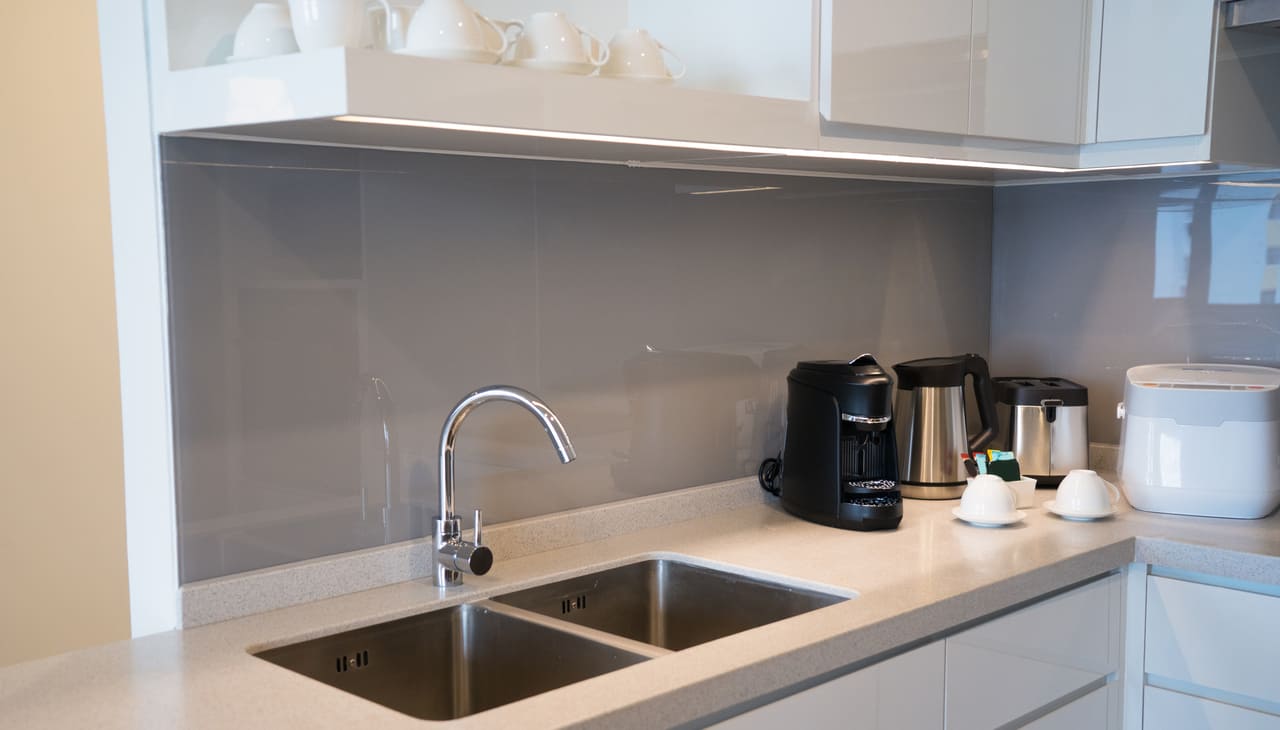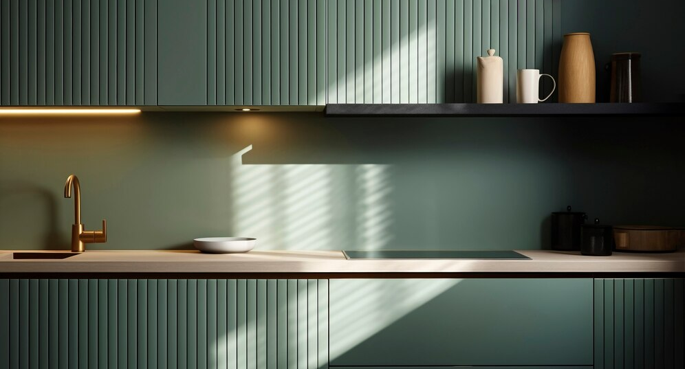 Фартук окрашен в тон, который отлично гармонирует с цветом фасадов гарнитура. Фото: freepik.com