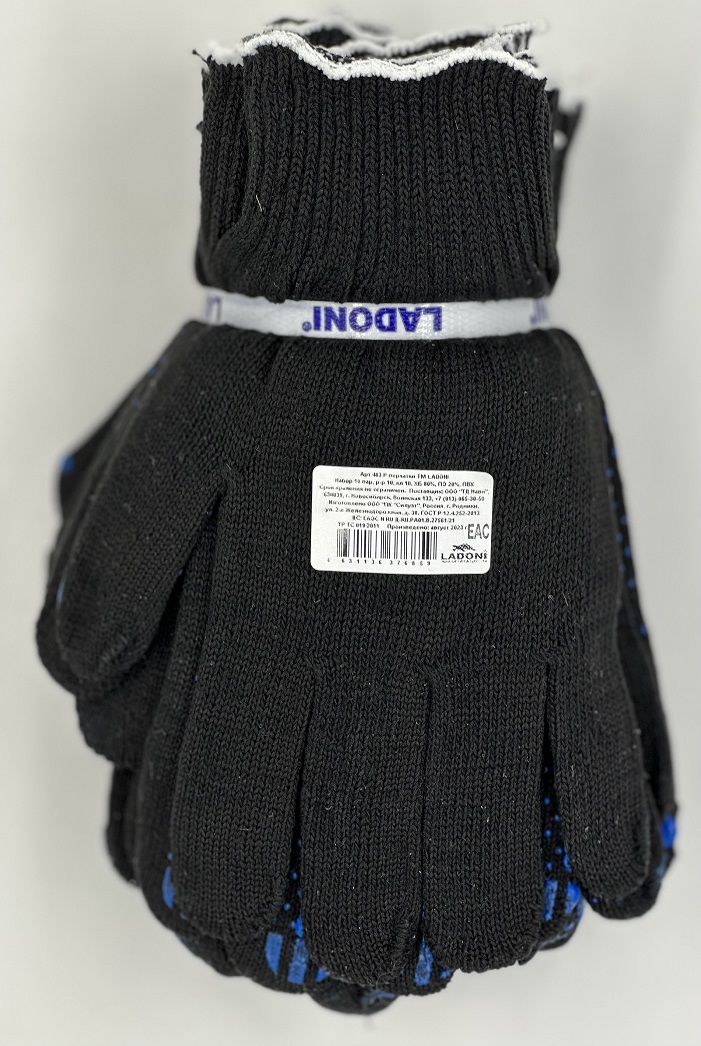 Перчатки ХБ с ПВХ НАБОР 10 пар: 10кл 5 нит 500гр, черн/син (арт.483 Р) Ladoni *1/40