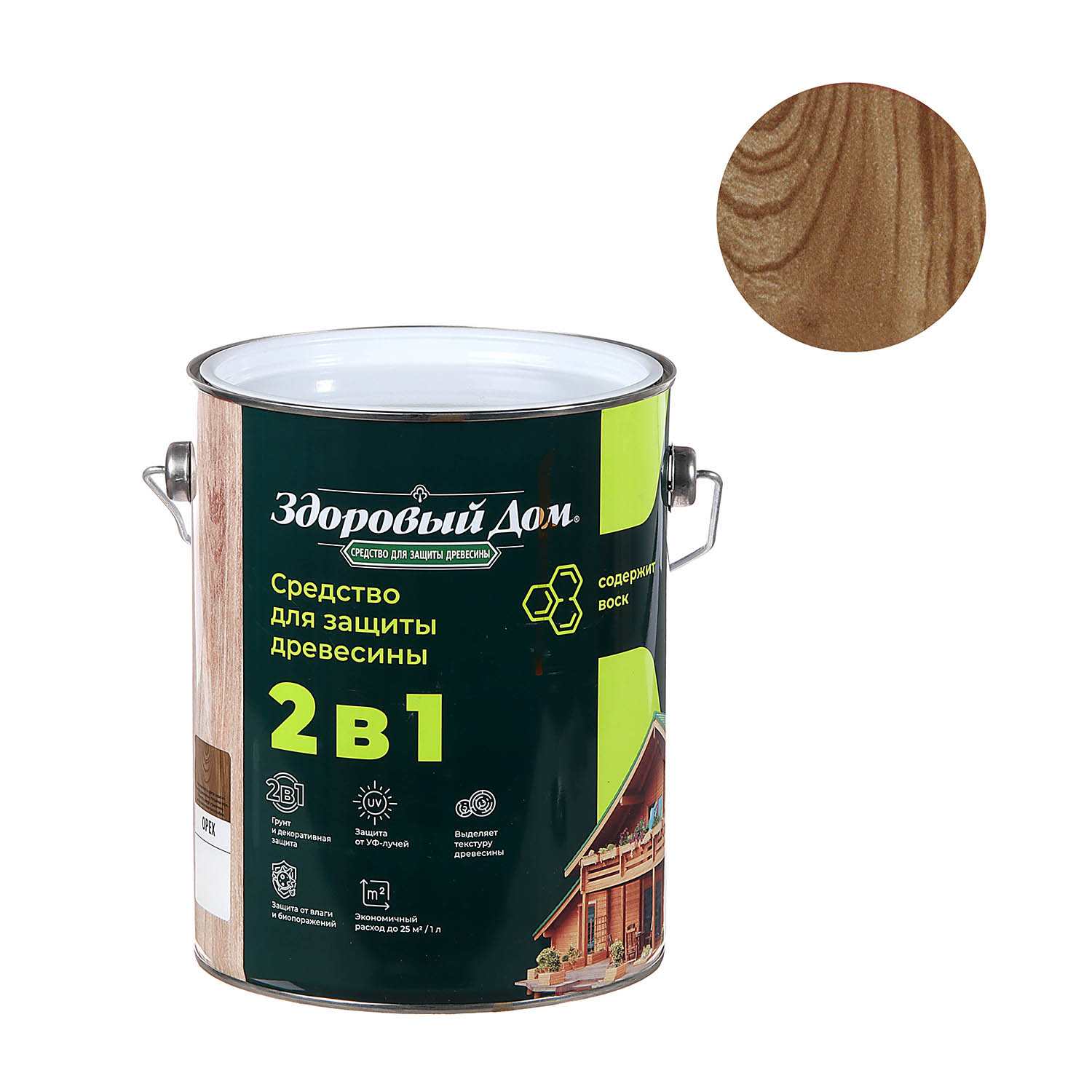 штДеревозащитное средство Здоровый дом 2 в 1 орех 2.7 л представляет собой высокоэффективное покрытие для декоративной отделки древесины и защиты поверхностей на срок до 8 лет. Формула 2 в 1 позволяет наносить состав без предварительного использования грунта.