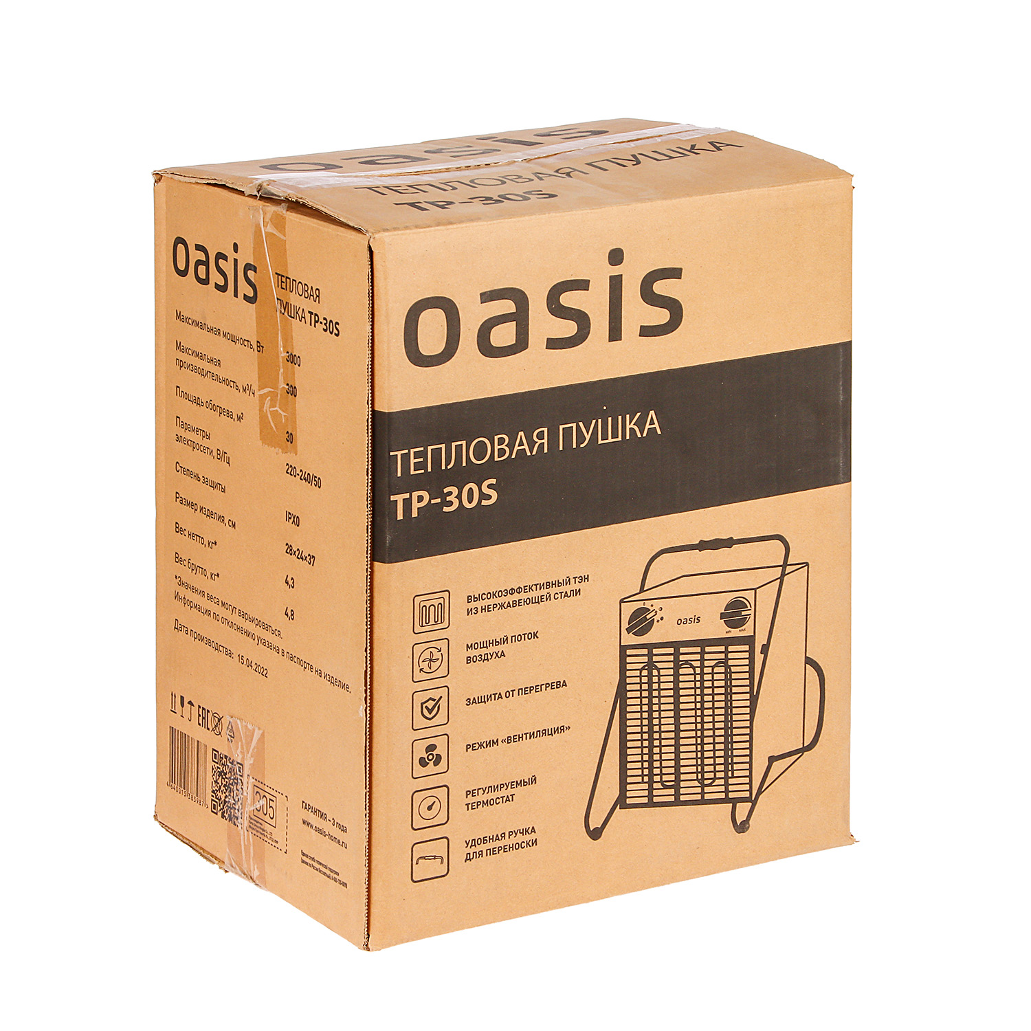 Пушка тепловая электрическая 3кВт 300м3/ч S-30м2 ТЭН 220В TP-30S (U) ОАЗИС *1