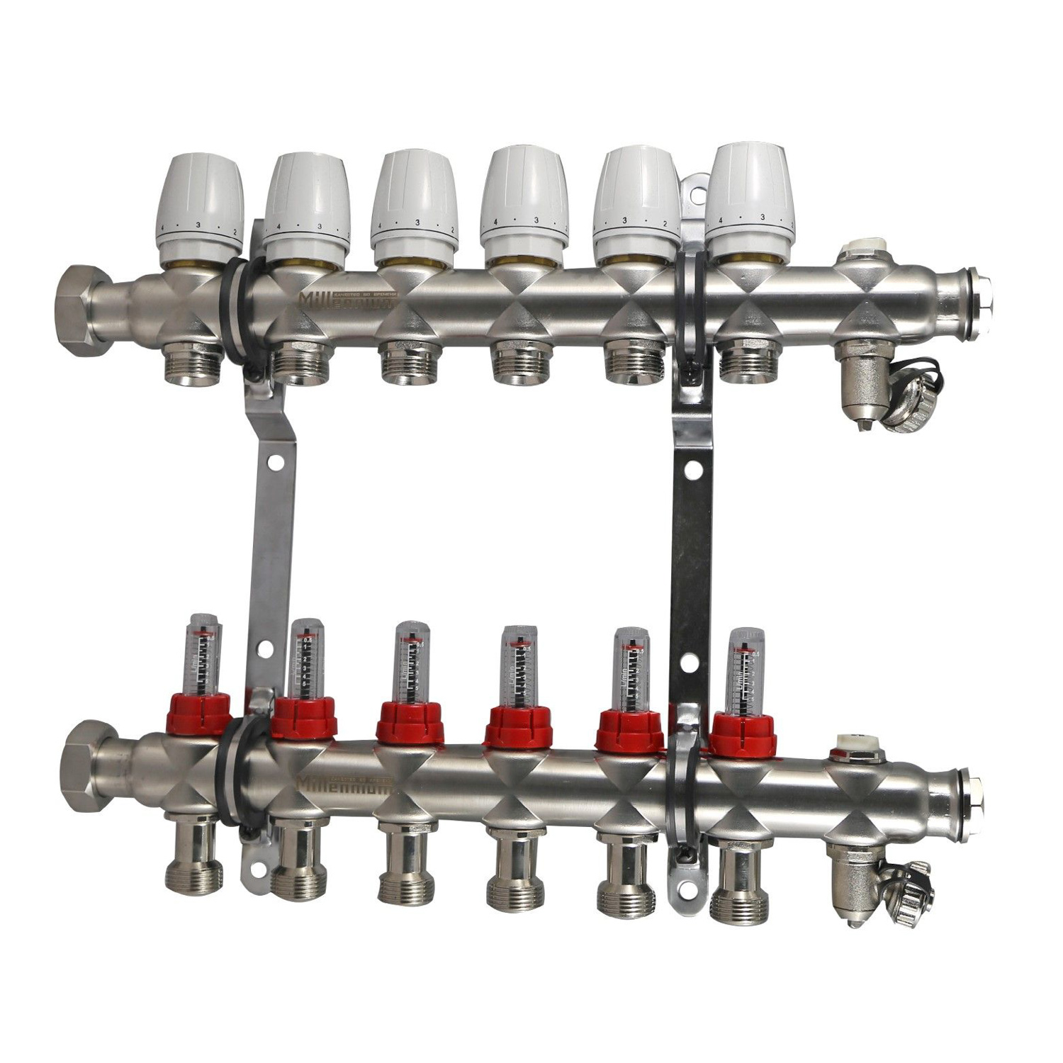 Коллекторная группа Millennium с расходомерами выполнена из нержавеющей стали, имеет регулировочные и термостатические вентили. Применяется при монтаже радиаторного отопления и теплых полов.