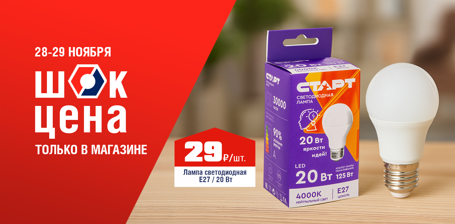 Надоело постоянно менять перегоревшие лампочки? Надежная светодиодная лампа на 20 Вт — то, что вам нужно! Она прослужит долгие годы, избавив вас от лишних хлопот и трат. 28 и 29 ноября в розничных магазинах ДомоСтрой не пропустите ШОК-цену: