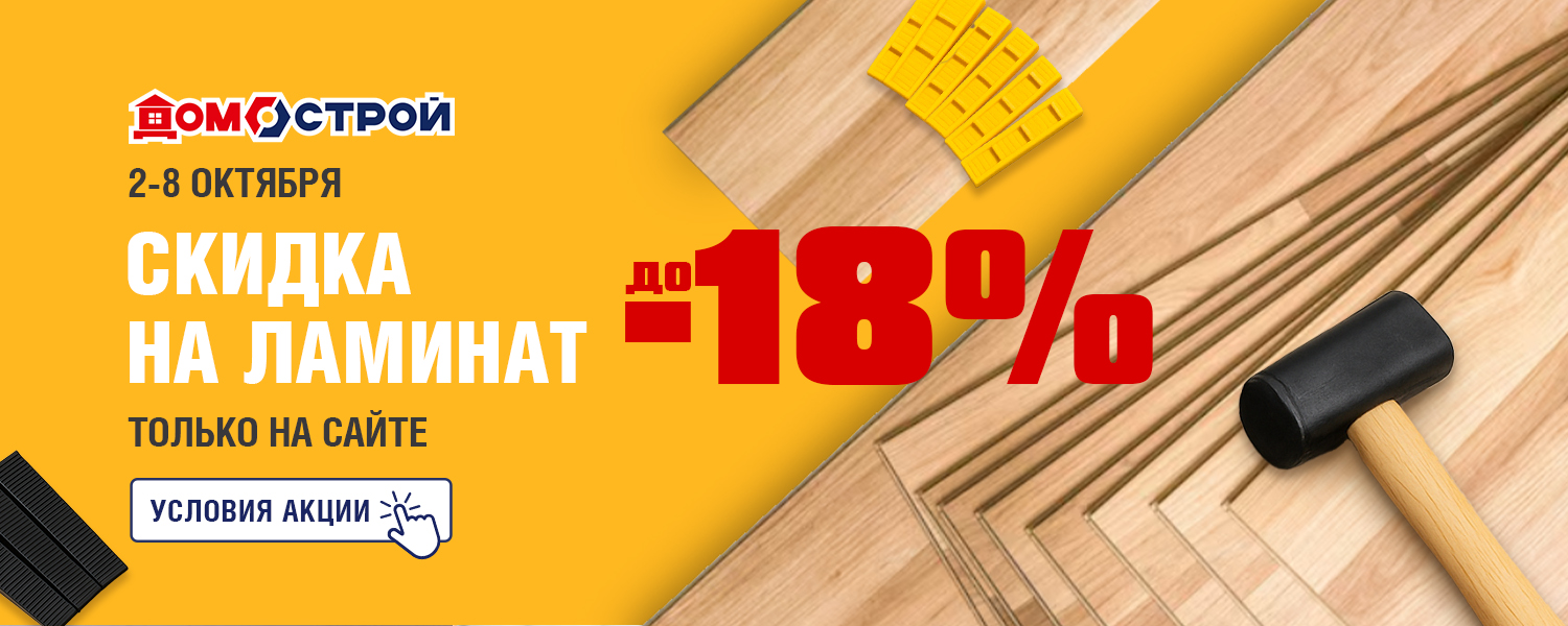 Онлайн-распродажа в сети ДомоСтрой! Со 2 по 8 октября — скидка до 18% на ламинат. Готовитесь к ремонту или мечтаете освежить интерьер? Не откладывайте — сейчас самое время выбрать ламинат по отличным ценам!